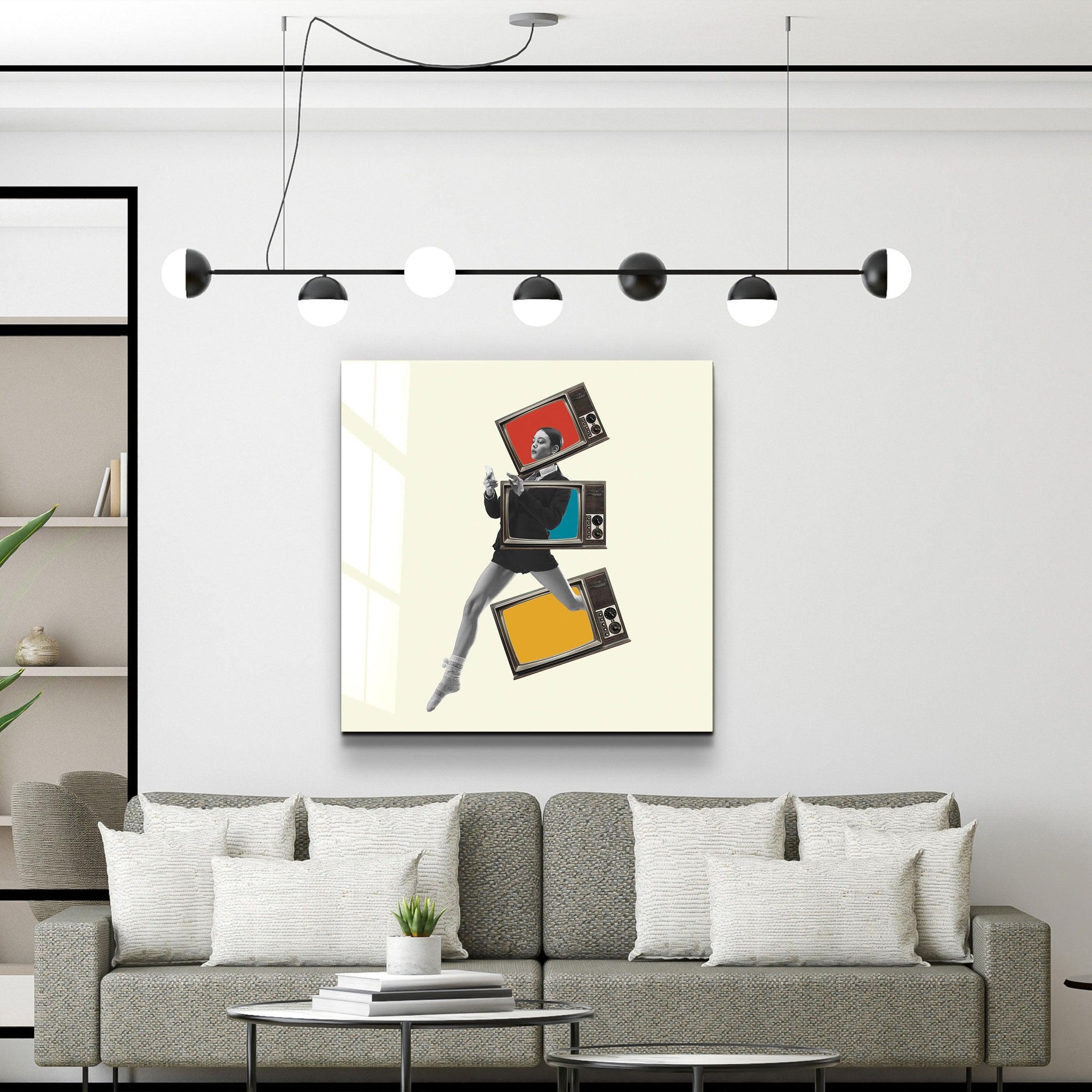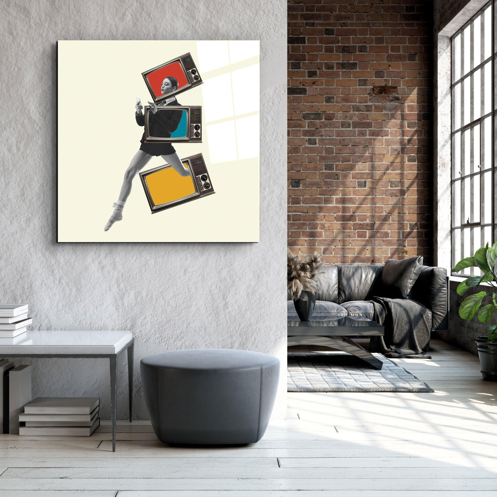 Experience a bold fusion of vintage charm and contemporary edge with “A little Hurry” from the Contemporary Collection Glass Wall Art. This imaginative piece blends a black-and-white, leaping figure with retro television frames, each frame filled with a vivid block of color—red, blue, and yellow—creating a thought-provoking centerpiece that catches the eye from across the room.