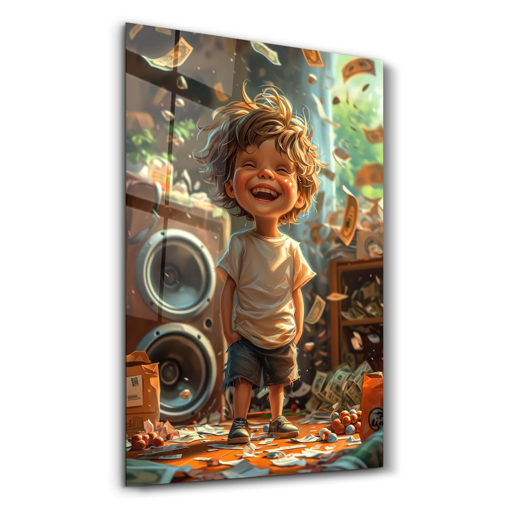 This manifest glass wall art beams in pure happiness and the carefree core of childhood. At the piece's heart, a young boy stands with an infectious smile while he is surrounded by gliding money and a lively mess of scattered objects. His wild hair and spirited expression grab the sense of freedom, fun, and an innocent unconcern for the world's seriousness.