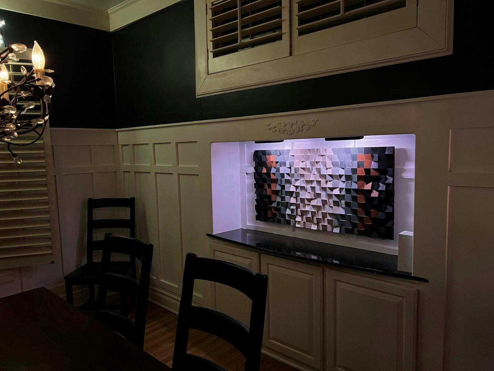 • In this remarkable rustic wooden wall decor series, our designers cut each small cube by hand and sand them individually. These pieces are painted separately with premium coloring to enhance their beauty and shield the wood at its finest. After painting and drying, the parts are attached to a wooden surface by a maximum-hold adhesive.
