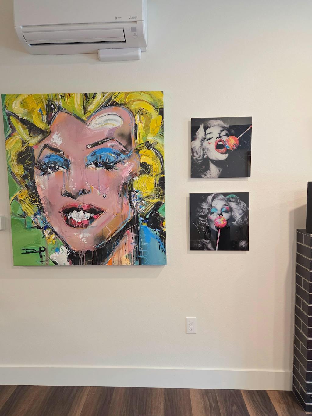 Add a bold and playful edge to your space with this Pop Art. This dramatic piece merges the timeless allure of black-and-white photography with the explosive vibrancy of pop art elements. The grayscale portrait of a classic, glamorous figure is accentuated by splashes of neon pink, electric green, and bright yellow, especially on the marbled lollipop she holds front and center. The vivid makeup—turquoise eyeshadow and hints of hot pink—further contrasts the monochrome tones, creating a striking visual story of elegance meeting modern rebellion. tropical wall décor, humorous dog art, vibrant bathroom décor, unique glass wall art.