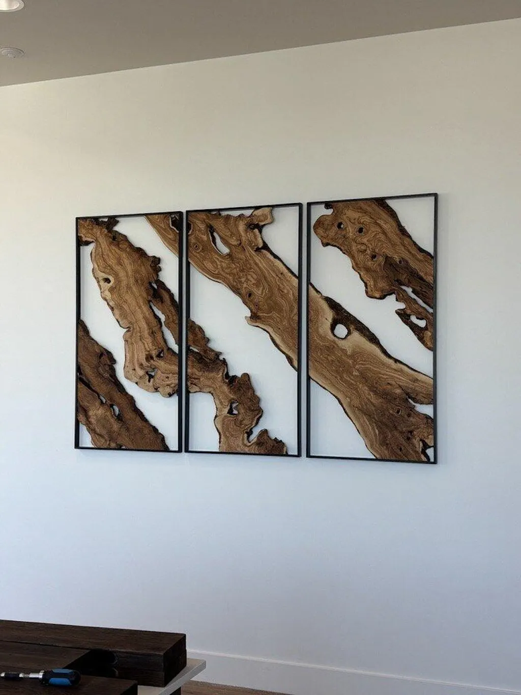 We absolutely loved the art, it looks beautiful. But there was obviously very little to no thought put into the hanging hardware. They attached the cheapest metal triangles in random spots on the wood, and some of them were even crooked. My husband hangs things constantly, has remodeled homes, used a laser level, and it took HOURS to hang because every single hook had to be measured separately, and there was ZERO room for error. It was incredibly frustrating. We finally got them hung and they were ever so slightly crooked so we used velcro command strips to stick to the bottom so they would stay level. It was a joke. They could have put hardware on the frame instead of random places on the wood, or took more care to find better hardware or at least make sure they were on straight! We would never order it again even though it was beautiful. It was an absolute pain. For the thousands of dollars we paid for this art I cannot believe how cheap and thoughtless the hardware was.