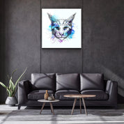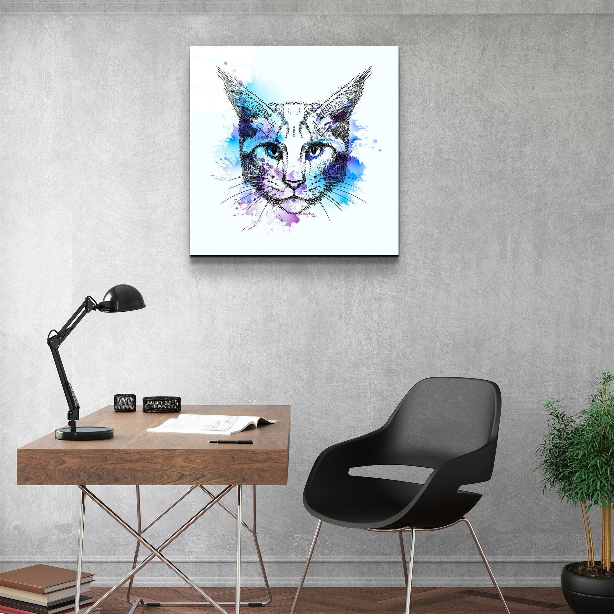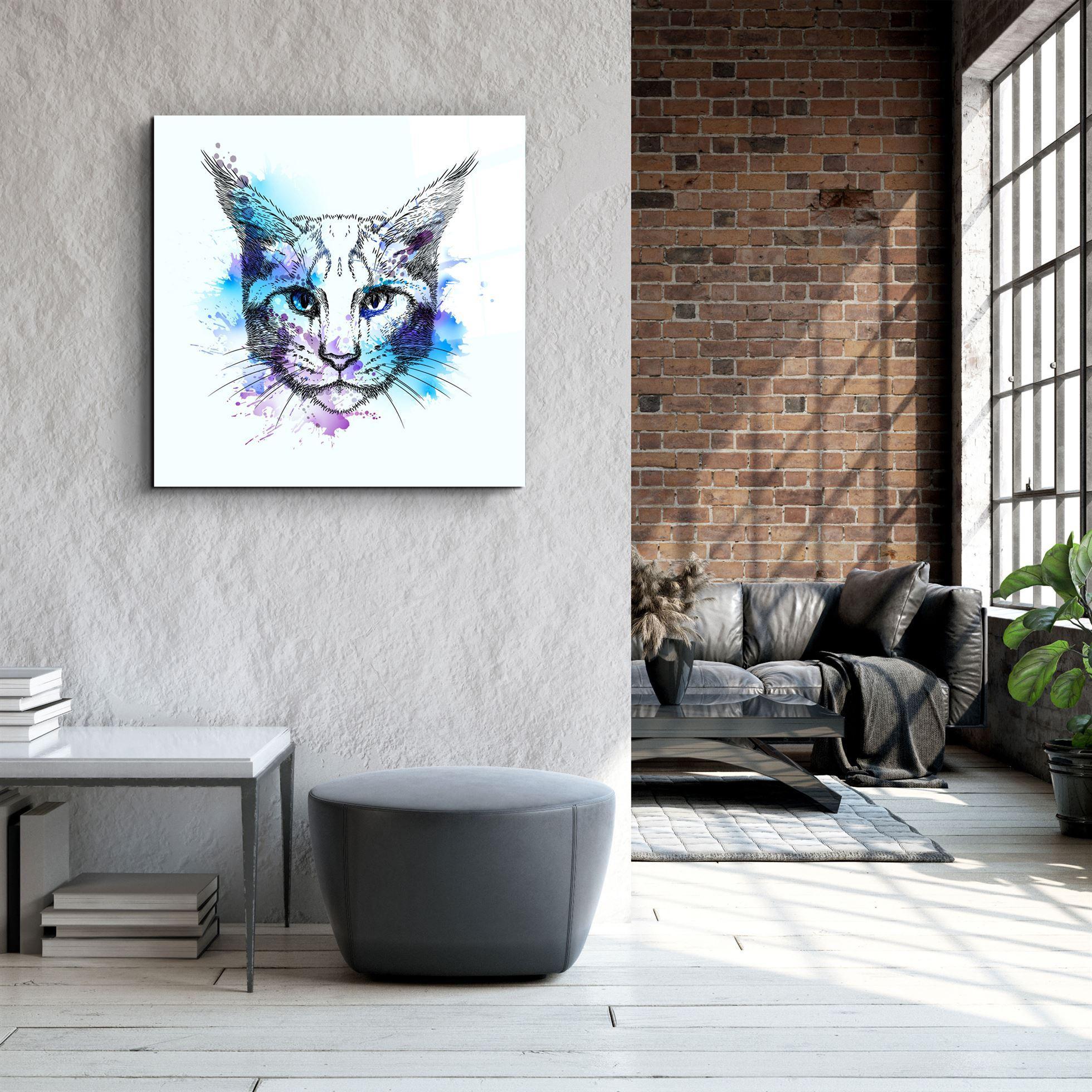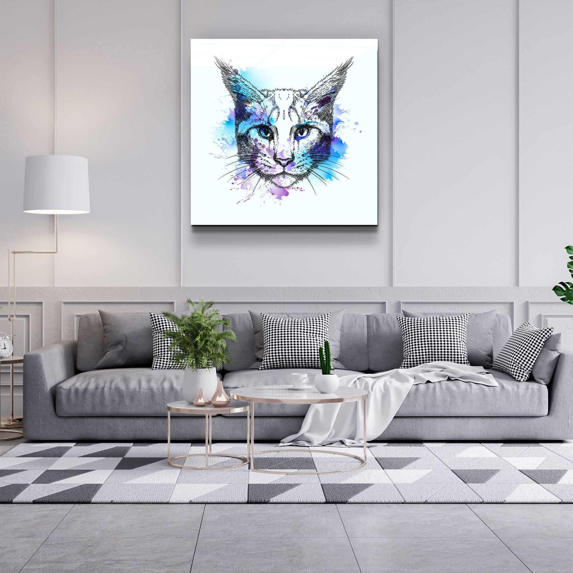 Add a touch of artistic flair to your space with this stunning glass wall art, featuring a captivating cat portrait brought to life with vibrant watercolor splashes in shades of blue and purple. The intricate hand-drawn details and dynamic paint splatters create a perfect blend of elegance and creativity.