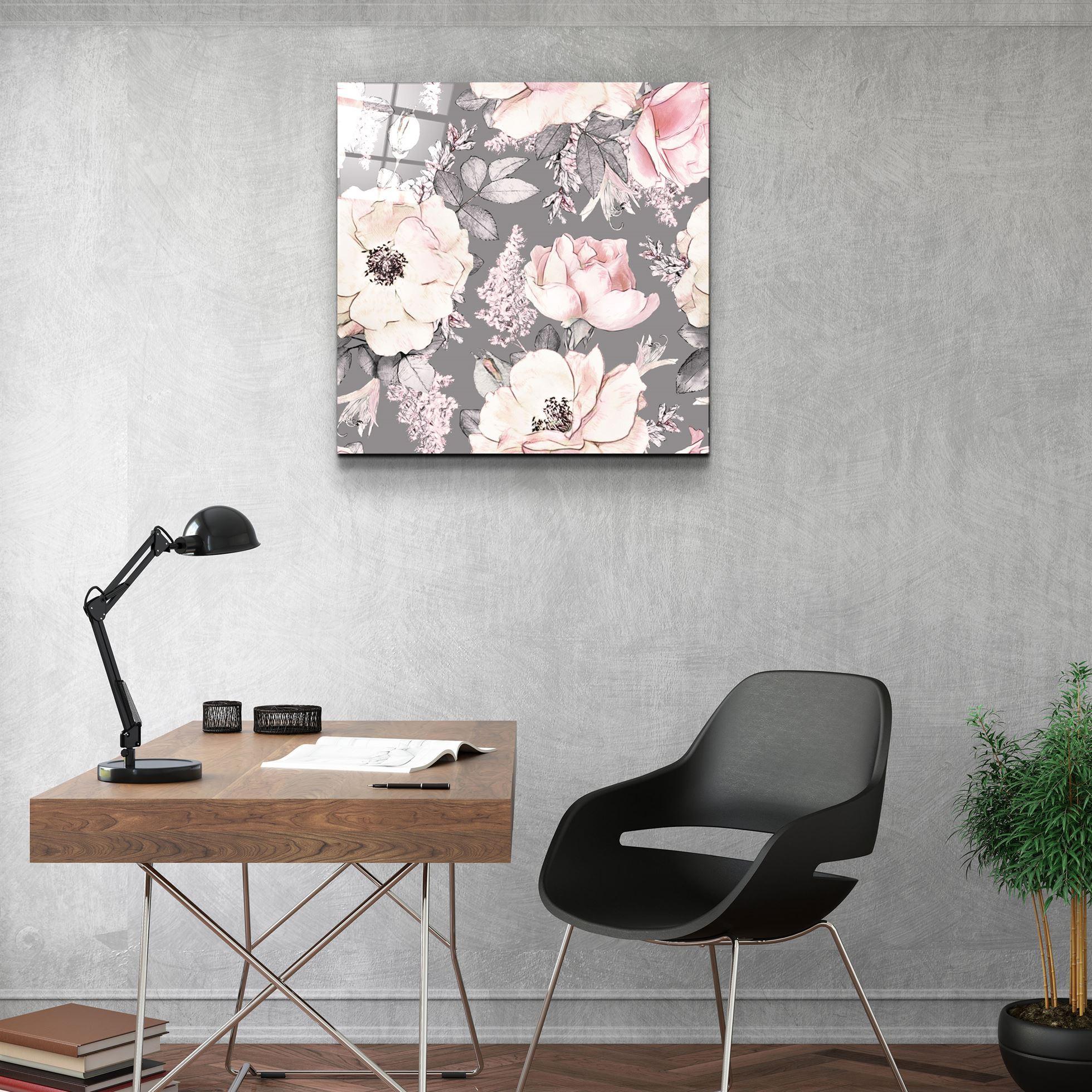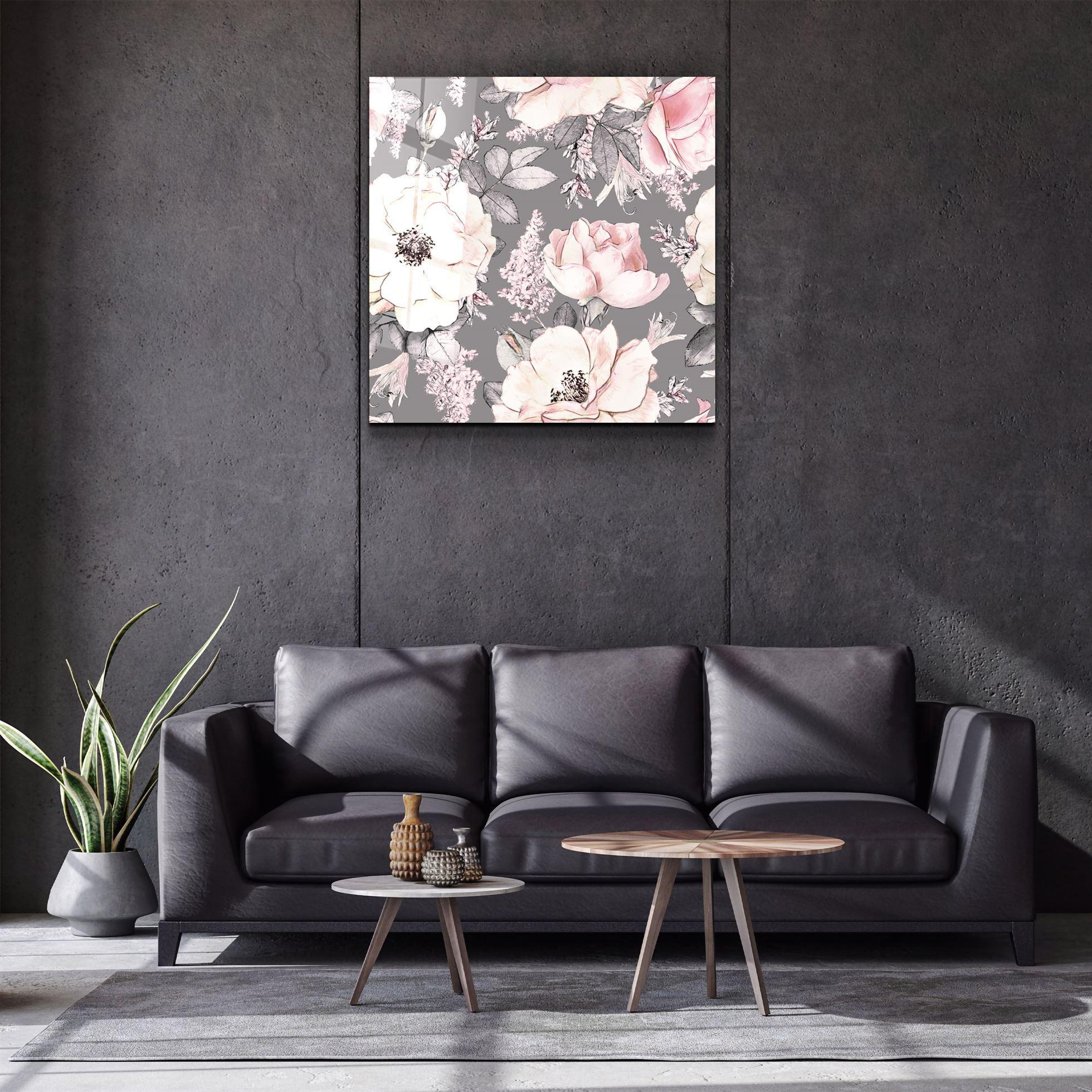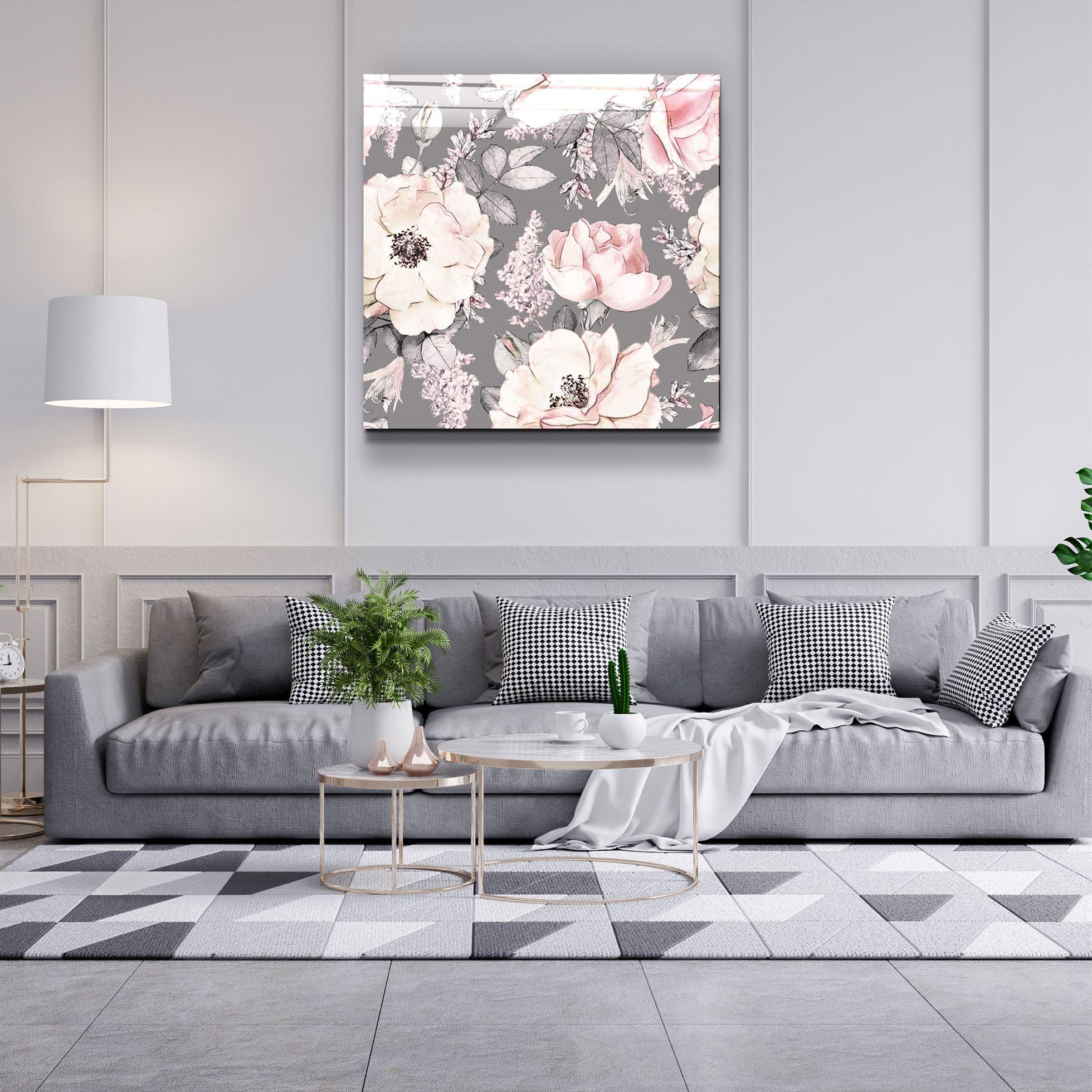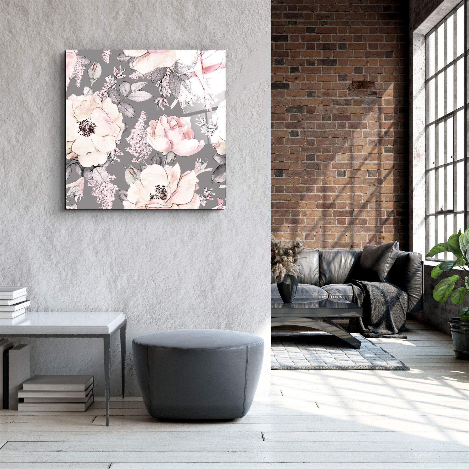 Bring a touch of elegance to your space with this exquisite glass wall art, featuring a delicate pattern of blush pink flowers and soft gray leaves against a muted background. The pastel hues and intricate botanical details create a graceful composition that is both timeless and modern. Printed on high-quality glass, this artwork captures each petal and leaf with exceptional clarity and depth.