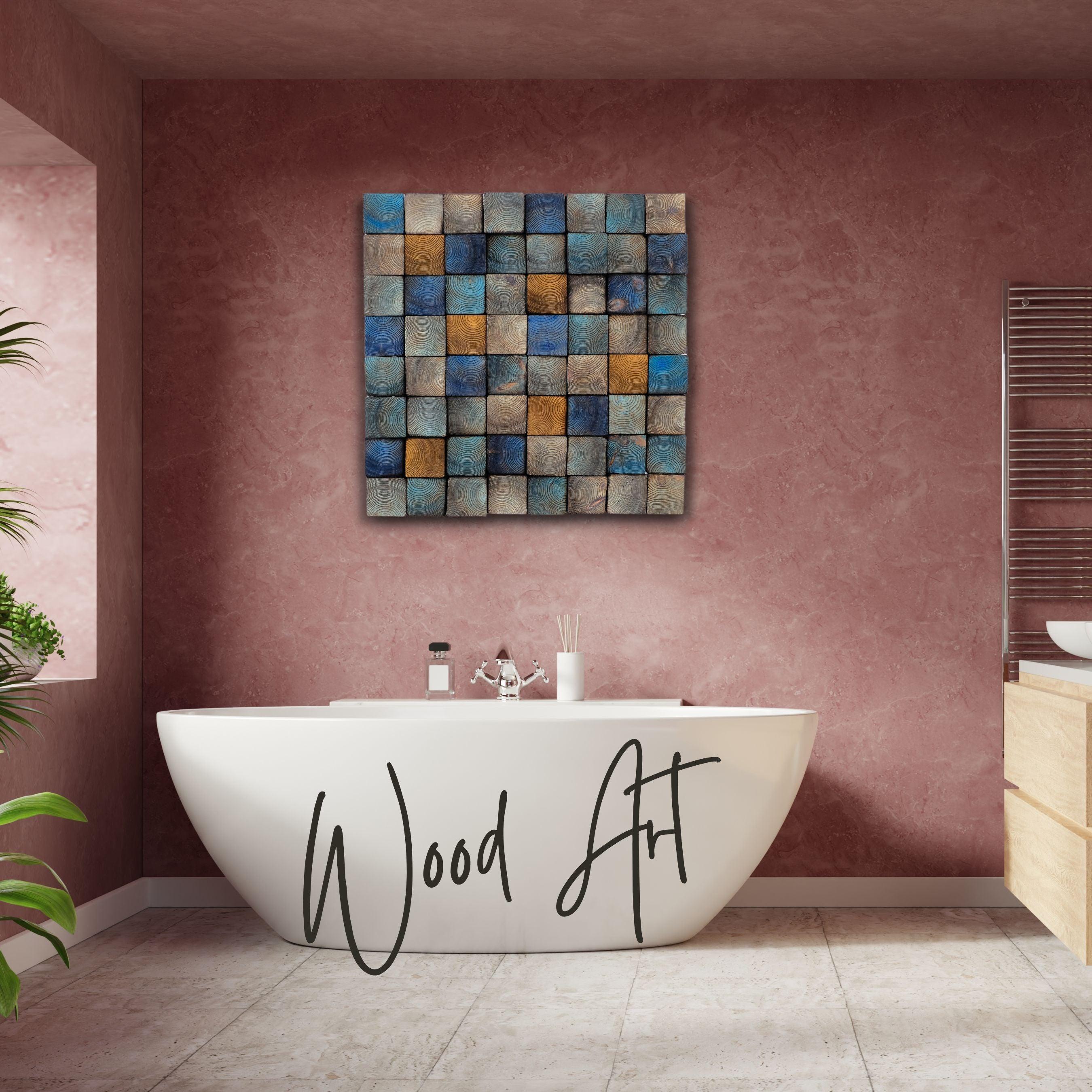 this wonderful rustic wooden wall decor is made of pine wood. After the small cubes were cut, burnt, and sanded by hand, they were painted one by one with wood paint. This form of painting enhances the beauty of the tree and protects the wood very well. After all, the parts are painted and dried, they have glued onto a wooden surface again.