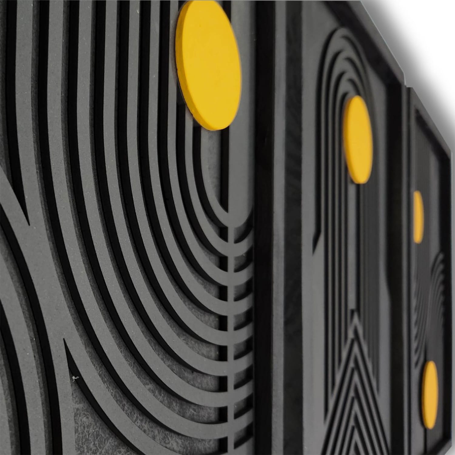Illuminate your space with the bold contrast of deep black wood and vibrant golden accents. This 3-piece handcrafted wooden wall art set showcases a striking mix of geometric precision and artistic warmth, creating a unique statement for any interior.